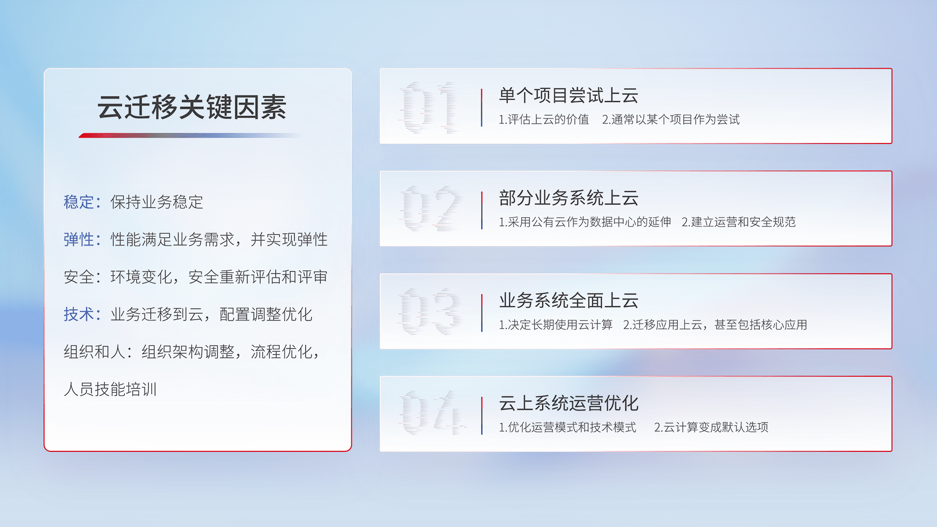 结合实际业务,,,从规划设计、、、、云平台选型、、云原生改造、、数据迁移、、、集成交付,,迁移全过程为客户识别最佳上云路径,,做好风险识别管理,,设计网络架构、、身份权限、、安全审计合规、、、、操作审计、、日志审计、、、、监控告警策略、、、、多站点容灾设计等,,,,对云上基础设施进行整体规划,,提升IT治理水平,,,以满足弹性、、、、高可用、、高性能的需求。。。。
