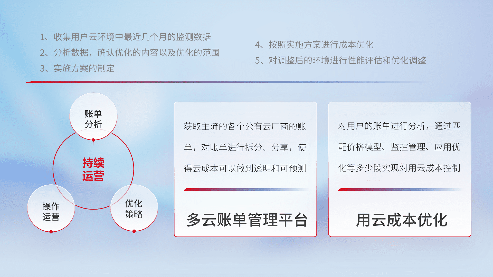 通过多云纳管,,,以统一的资源数据模型把客户的云资源进行抽象和封装,,,进而实现对多云资源的统一操作,,,,保障云资源管理的可靠性、、、稳定性与可用性。。。。量身定制化运维内容,,,配置、、开发运维、、补丁管理、、、、备份、、、、监控、、、、认证和访问管理、、、审计和日常巡检等,,保障在用云过程中的可靠度,,,稳定度以及高可用率。。。。